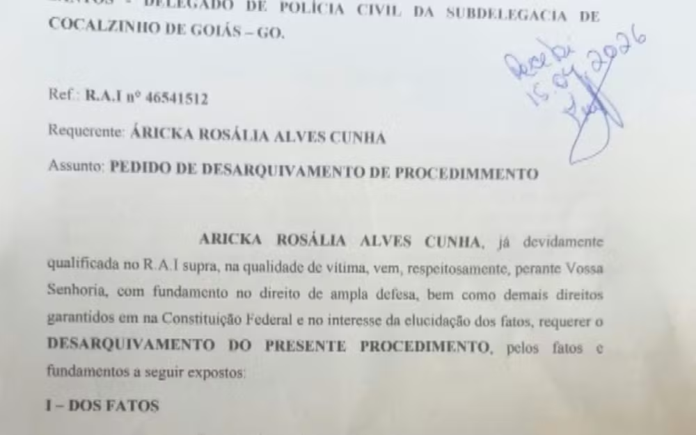 A advogada Áricka Cunha solicitou ao delegado de Cocalzinho o desarquivamento do registro e divulgou o pedido nas redes sociais — Foto: Reprodução/ TV Anhanguera