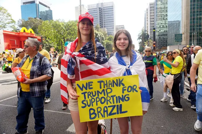 A presença da bandeira americana nos protestos bolsonaristas no Brasil foi destaque nas páginas do The New York Times. Apoiadores de Jair Bolsonaro participam de manifestação na Avenida Paulista, em São Paulo, Brasil, em 3 de agosto de 2025