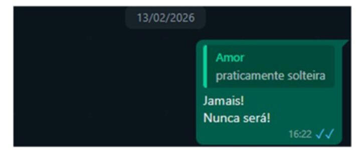 Não é possível saber com precisão a data em que a mulher envia o texto, mas o tenente-coronel a responde no dia 13 de fevereiro, cinco dias antes da morte. “Diferentemente do aventado pelo indiciado, a questão do divórcio é o ponto central do conflito do casal e revela uma contradição gritante entre a versão oficial apresentada por Geraldo e a realidade documentada nas conversas de WhatsApp e depoimentos de familiares”, afirma a polícia, em outra parte do relatório.