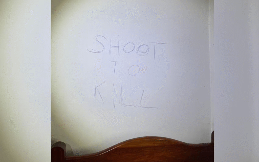 Em um dos desenhos, suspeito escreveu frase usada por muçulmanos abaixo de uma suástica. Em outro, ele escreveu em inglês ‘shoot to kill’, traduzido como ‘atire para matar’